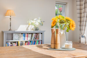 Choose the right floral display for each area. A hand-picked posy is perfect for a country kitchen. Tall, tasteful lilies add elegance to a large dining table. Don’t forget bedrooms too – a mini-vase on a bedside table with a small sprig of seasonal flowers is a lovely touch.