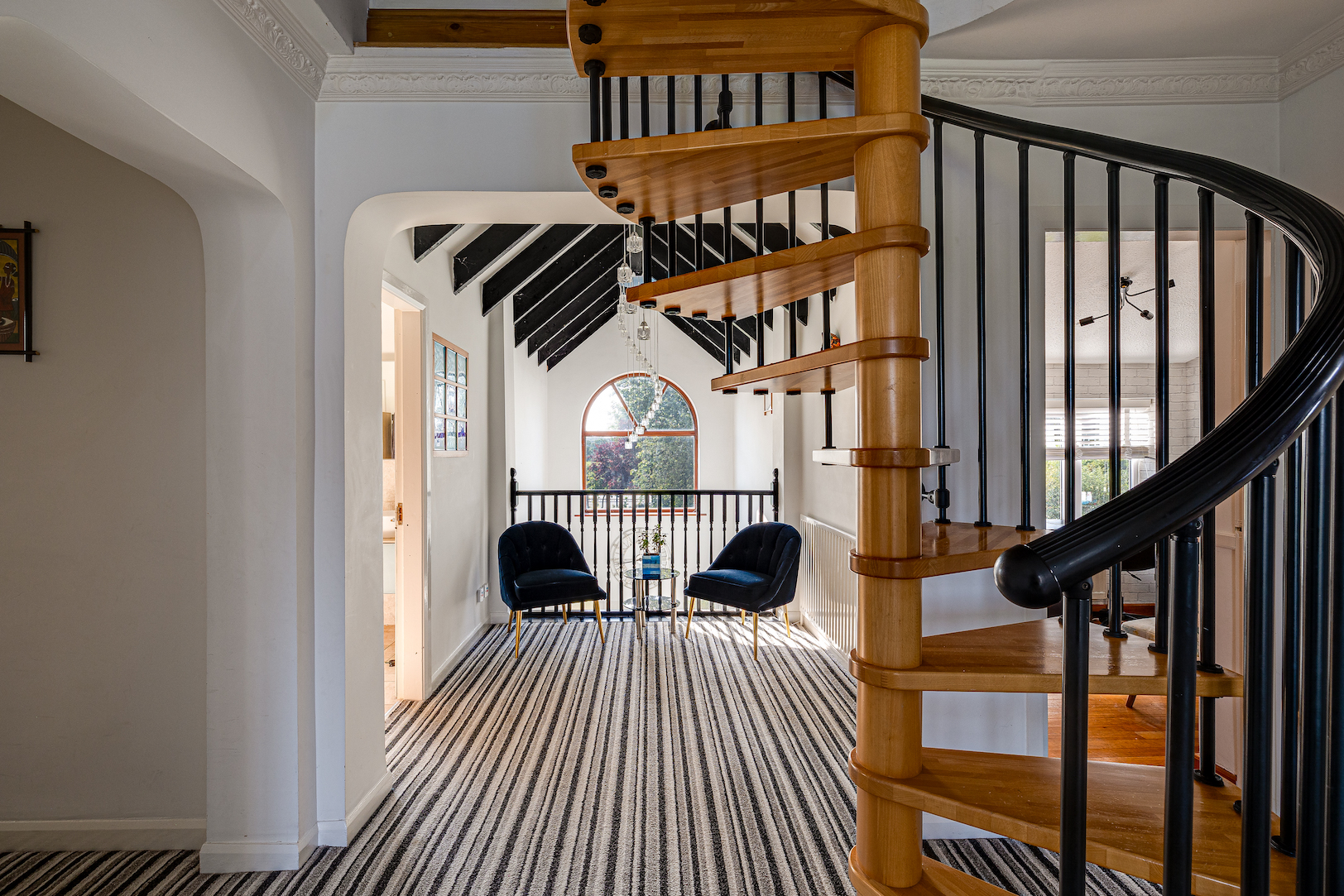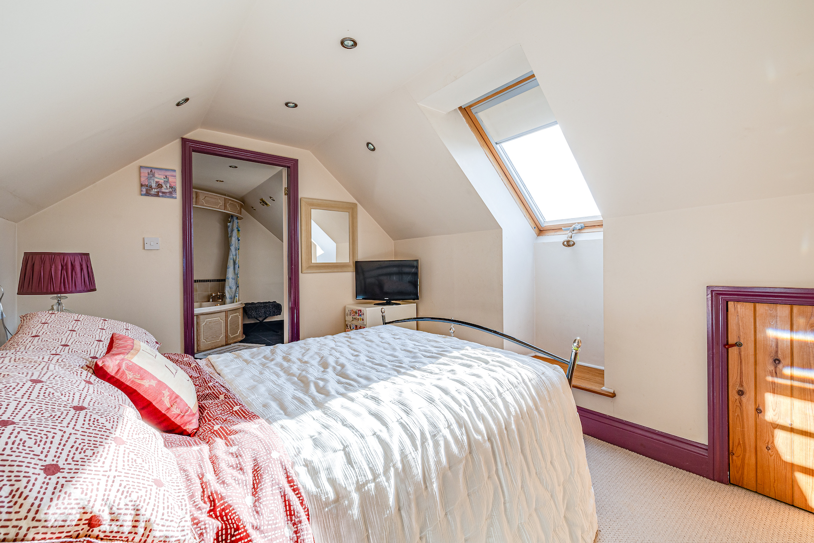 Returning to the main landing, oak and iron stairs spiral up to the second floor. Home to the most incredible views, this penthouse level offers so much potential. Currently configurated as two good sized bedrooms – both with storage and one benefitting from an ensuite bathroom containing bath with shower, wash basin and WC – consider the potential to create a luxuriously sized master suite on this floor, or perhaps a self-contained apartment for an older teenager, with bedroom, lounge-games room and bathroom?