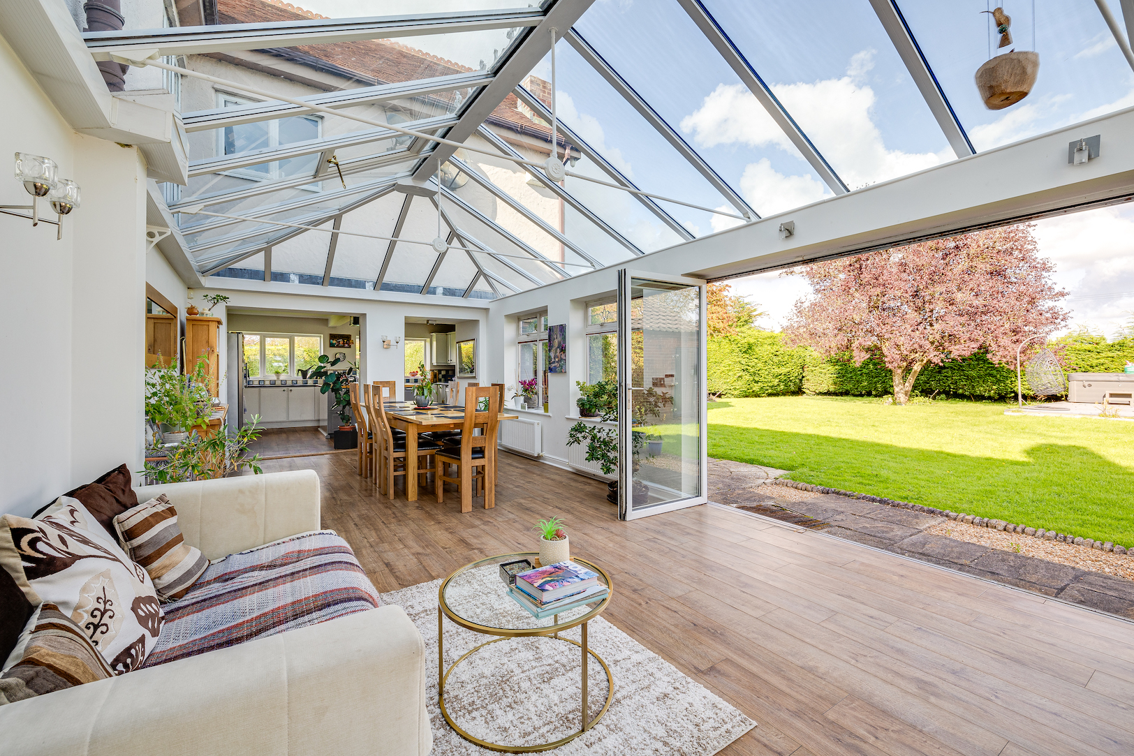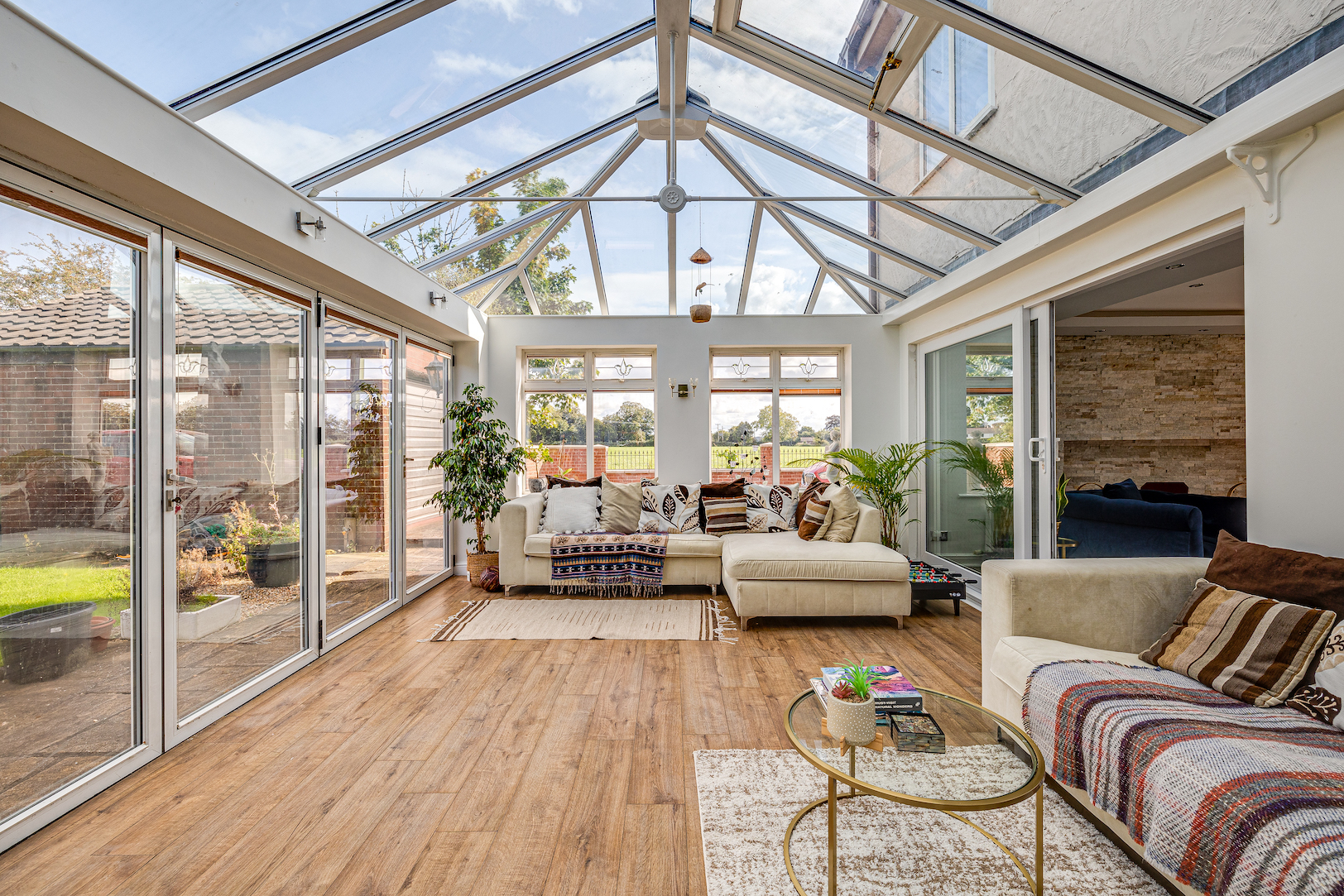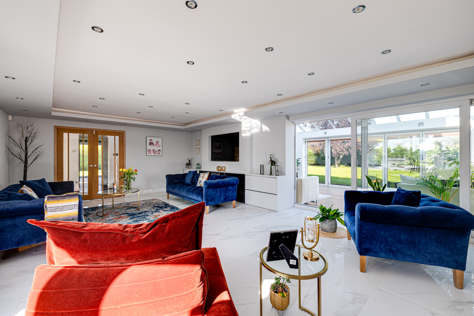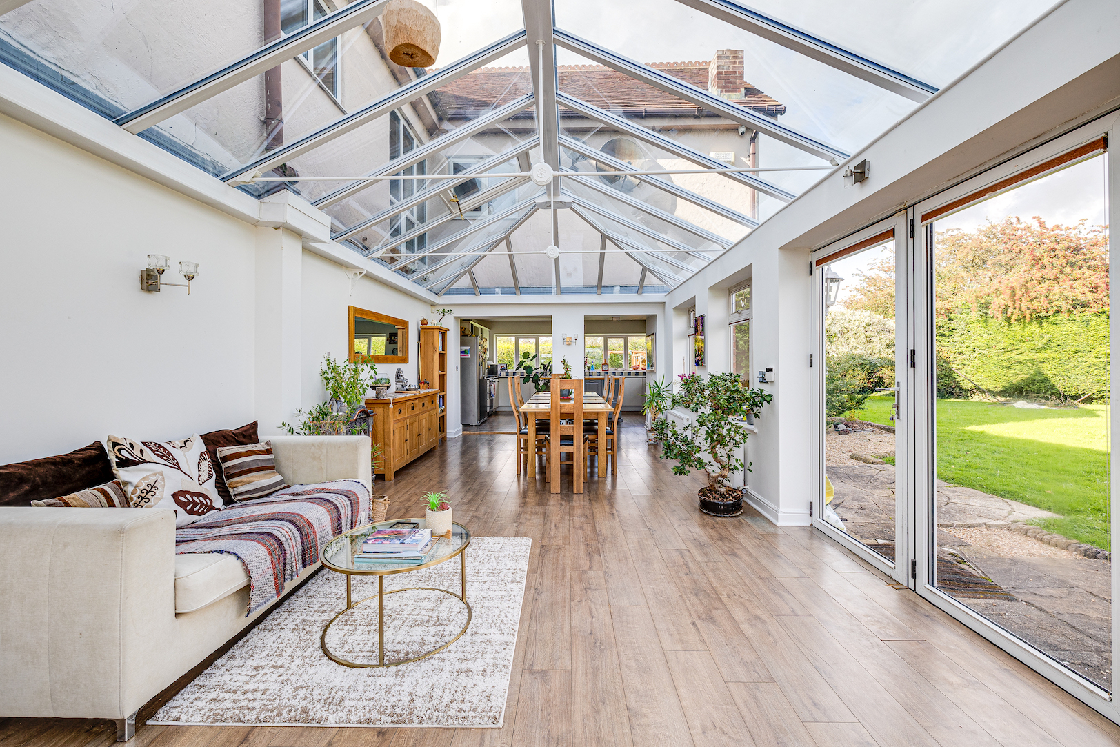 A sublimely light room, peaceful and private, a bay window frames views out, whilst a glazed sliding door opposite opens to the stunning orangery to the rear. Serving as a living-dining area, this capacious space offers direct access to the garden, enabling indoor-out living for all the family.