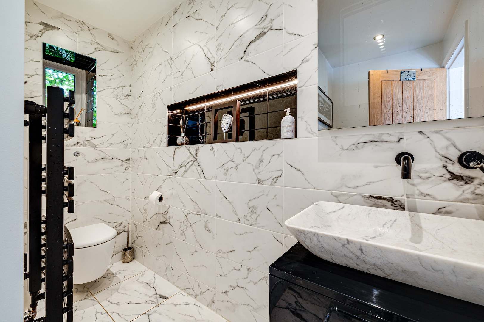 Ahead and on the right, marbled tiles add a sense of luxury and refinement to the downstairs WC, where storage is available in the drawers beneath the wall mounted wash basin.