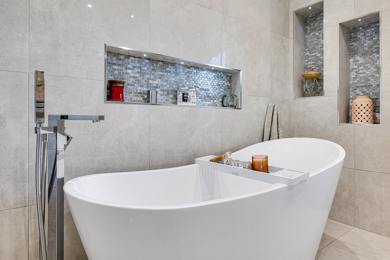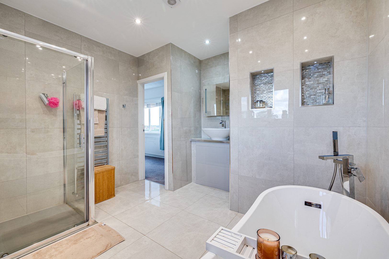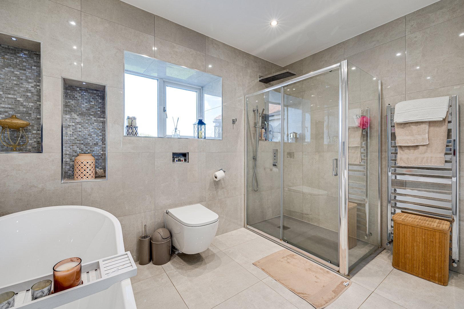 Soothe your senses in the luxuriously sized ensuite, where alcove shelving to the walls is contemporary and chic. Enjoy a soak in the freestanding bath, with floor mounted tap, or begin your day with a spritz beneath the rainfall head of the large, walk-in shower. Indulgently spacious, this beautifully tiled bathroom also includes a wall mounted WC and vanity unit wash basin with LED mirror above.