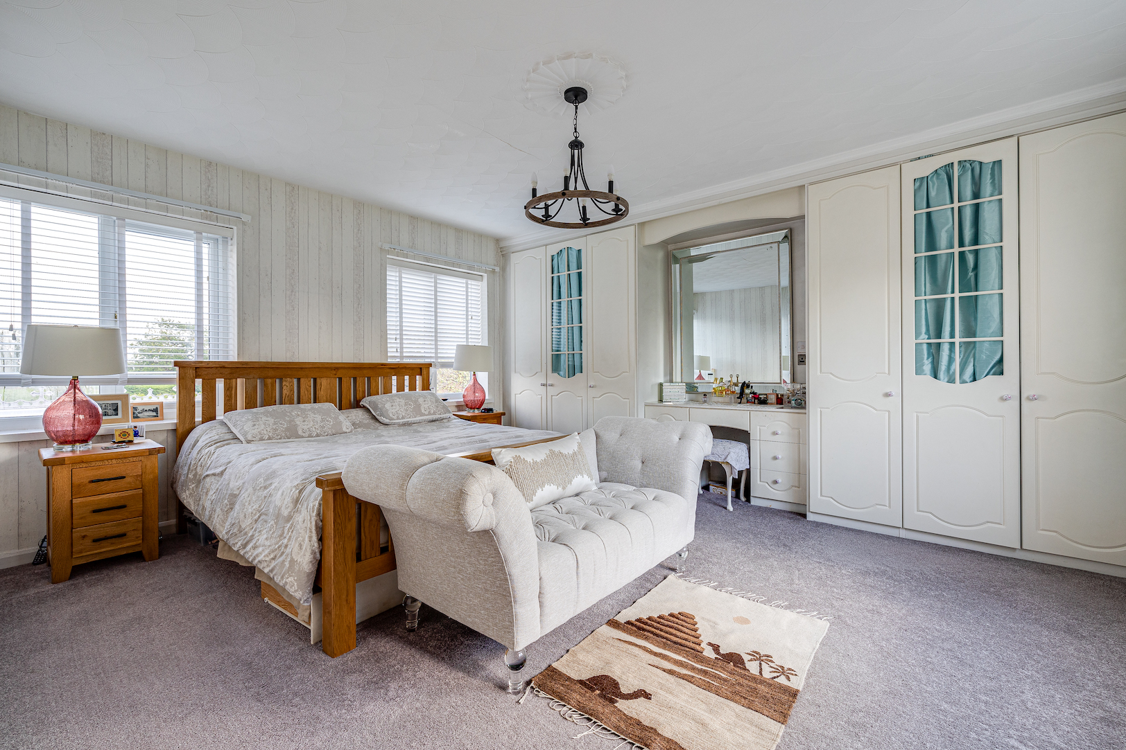 Serene and stylish, the sumptuously sized master suite offers ample scope for rest and relaxation, with space for a sofa and super-king-size bed. Windows to the front and rear invite a constant flow of light through, whilst framing far reaching views out over the garden to both sides and to the hills and countryside beyond.