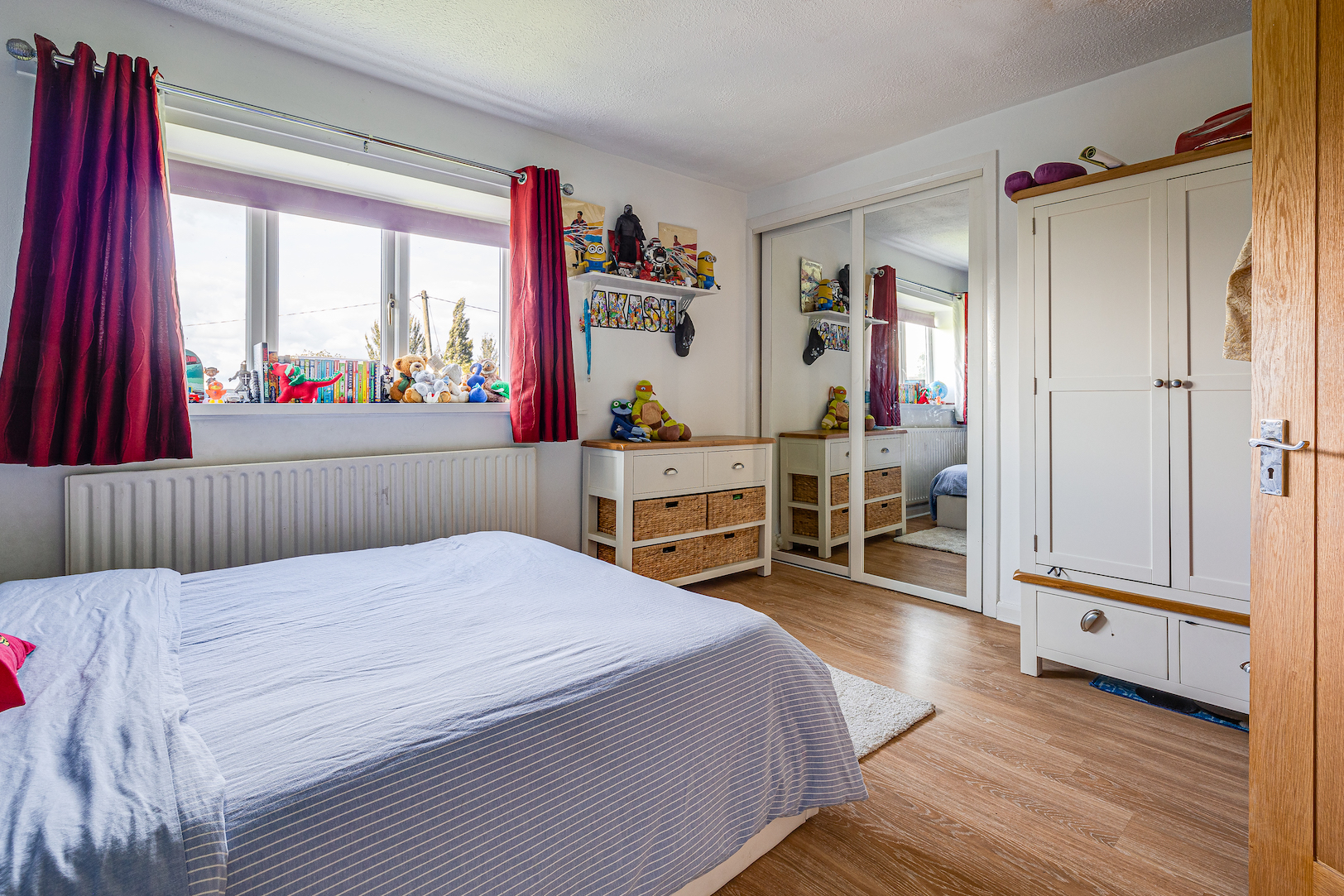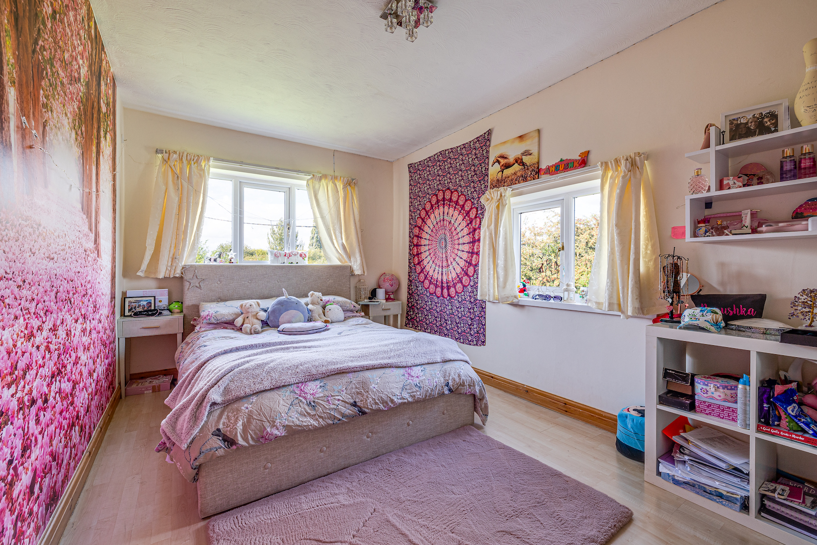 With a built-in, mirrored wardrobe, another spacious double bedroom features laminate flooring and looks out over the wraparound garden and fields beyond.