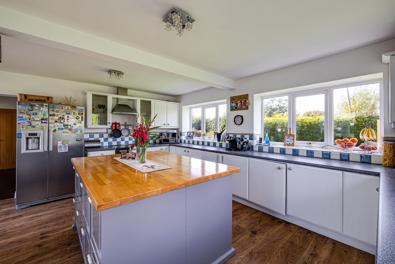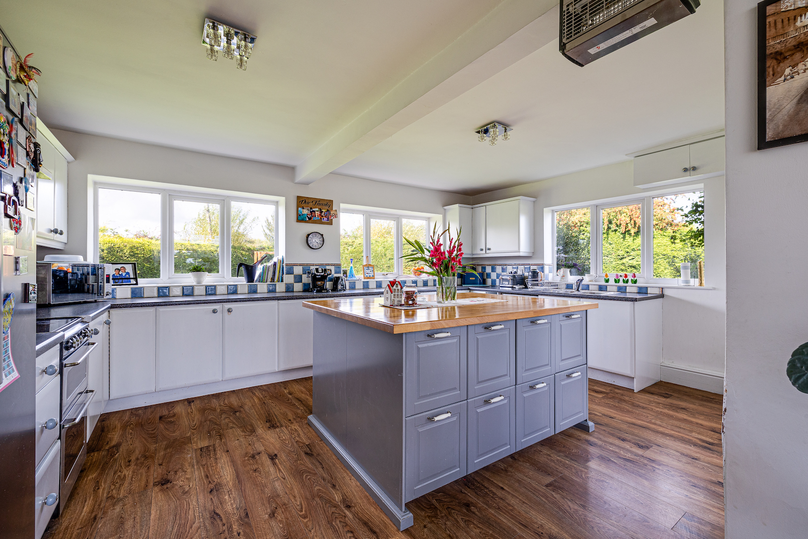 A home with such ease of flow, the orangery opens up to the contemporary kitchen beyond, where there is an abundance of storage space in the white cupboards and drawers. A home epitomised by its light and views, the kitchen windows frame vistas over the private, enclosed garden. With so much space for all the family, there is also a large central island-breakfast bar, a sociable space around which to gather and dine. A host of appliances includes an oven, hob, extractor fan and sink with ample room for a fridge-freezer.