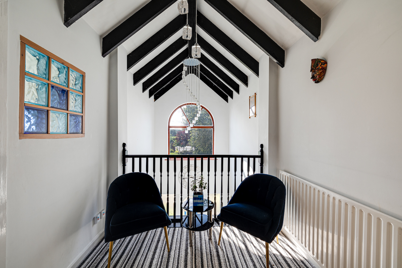 From the entrance hall, ascend the handsome returning staircase, where light flows down from above, before reaching the gallery landing, set beneath a vaulted, beam bedecked ceiling. Light serenades the space, flowing in through an arched window overlooking the extensive garden to the front, where mature trees provide privacy.