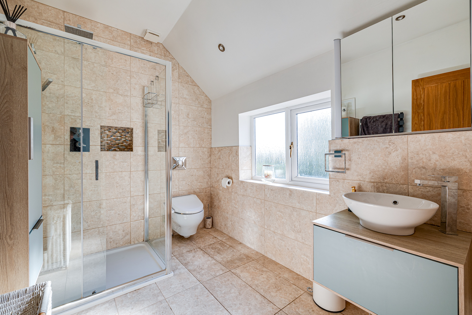 At the front of the house, with a coloured glass brick internal window, step through into the lavishly sized family bathroom. Tiled underfoot and to the walls in buff tones, a large walk-in shower with rainfall head offers refreshment, with a low-level WC and wall-mounted vanity unit wash basin also available.