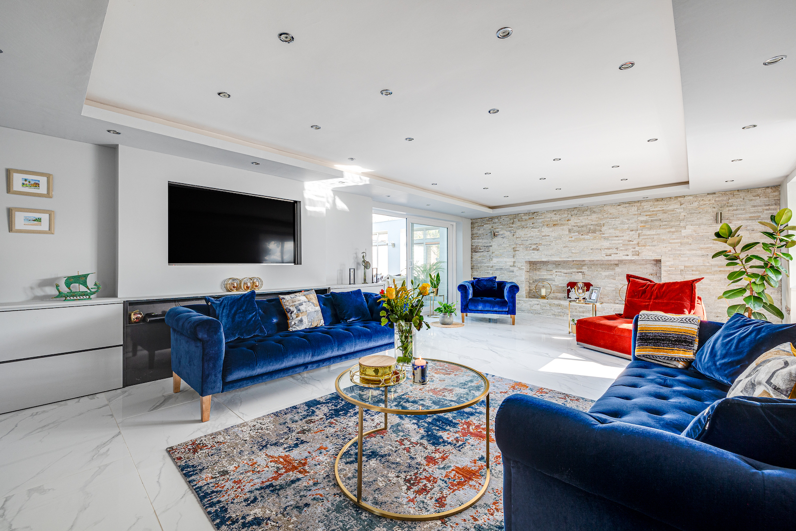 Next on the right, glass panelled oak doors open to the impressive, modernised living room, where spotlighting shines down from above and fitted units provide storage in the media wall where an inset television sleekly sits.