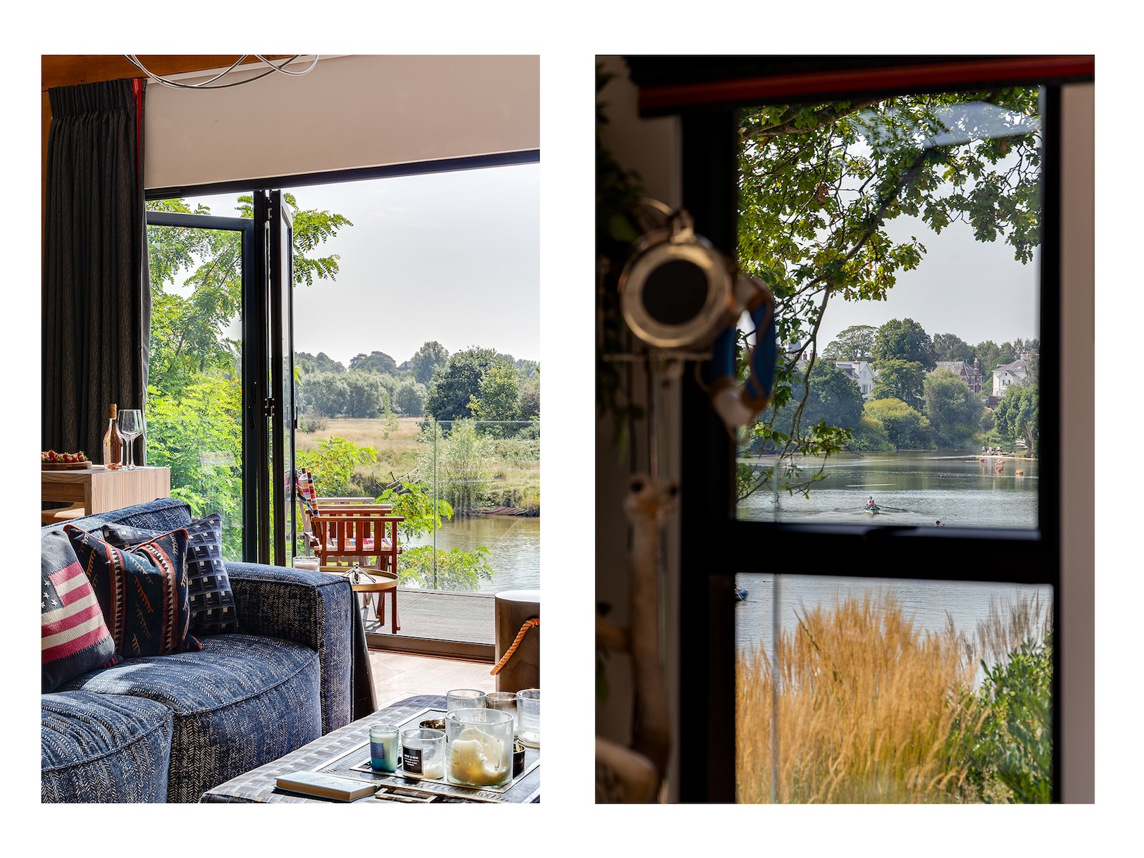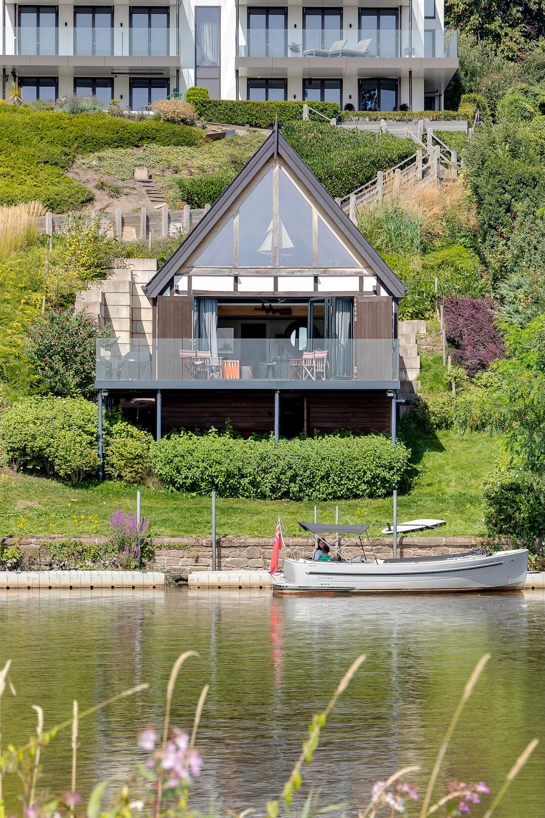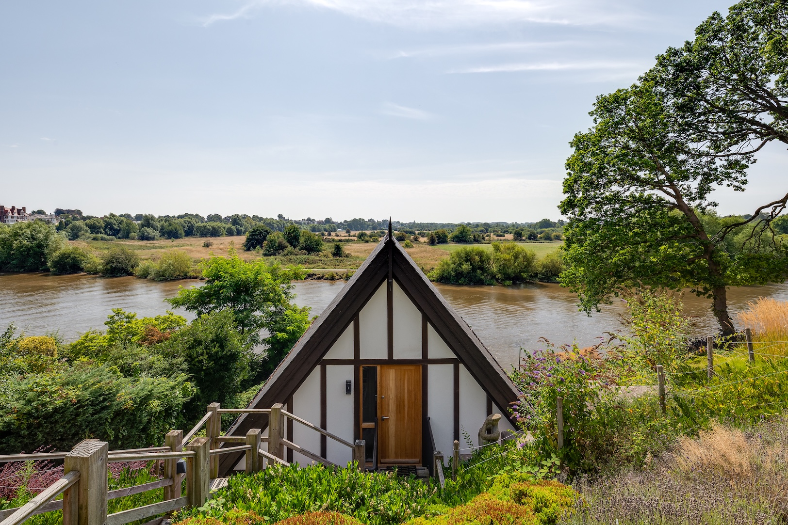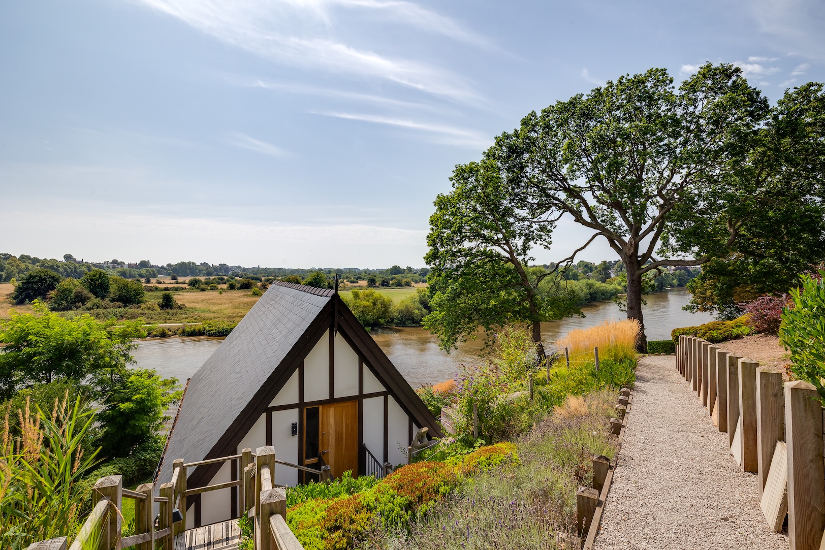 The approach to The Boathouse is both discreet and enchanting. Steps lead you down through landscaped grounds towards the water’s edge, creating a sense of anticipation as the river slowly comes into view. It is a fitting entrance to a property where natural beauty and thoughtful design intertwine.