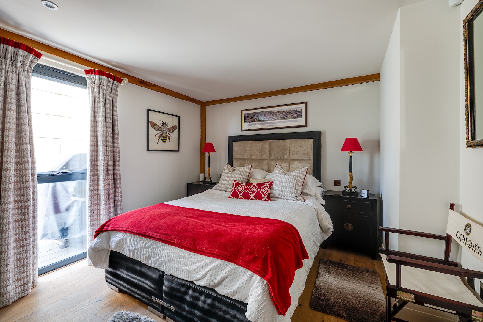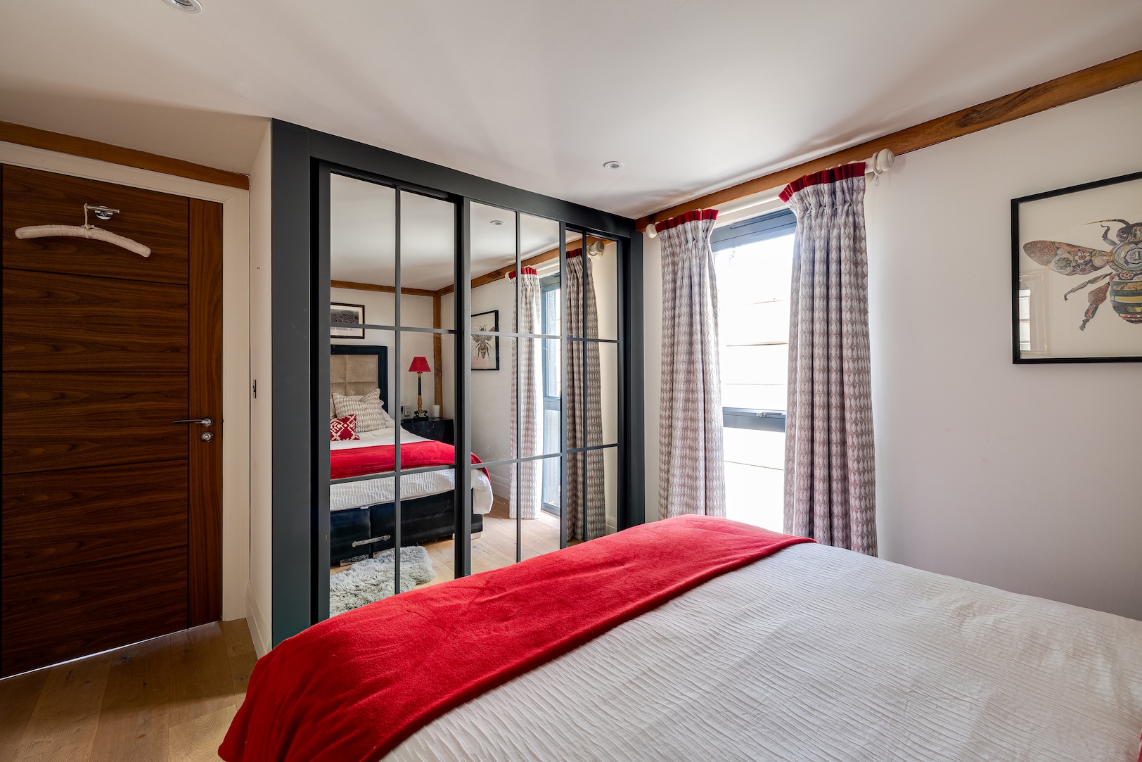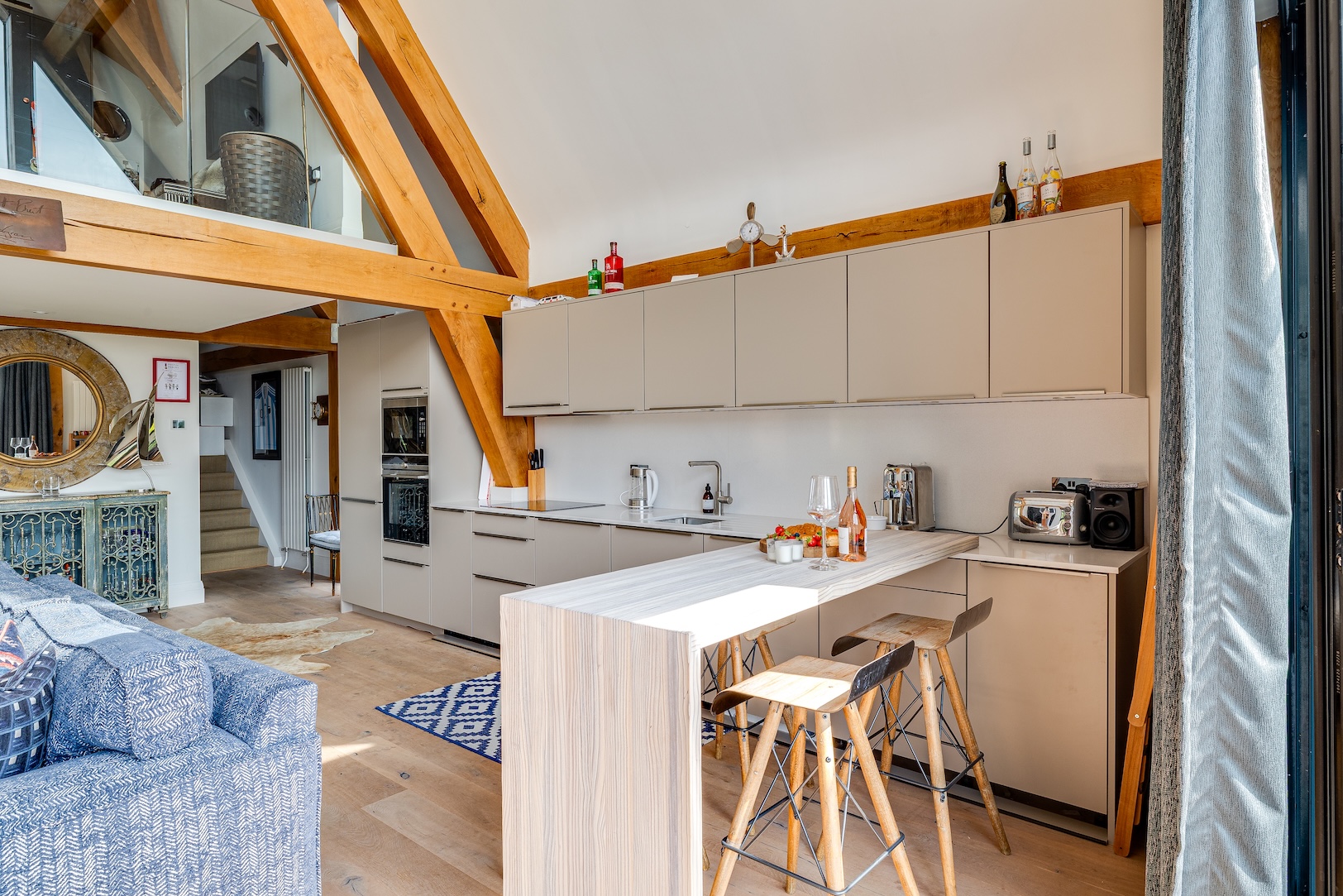 On the upper floor lies a calm and characterful bedroom, its exposed beams offering warmth and texture against clean, contemporary finishes. Glass balustrades introduce a sense of openness, allowing light to filter between floors while framing views towards the ground level and the river beyond. A modern shower room sits alongside, cleverly designed with privacy and ease in mind, ensuring this floor functions as a self-contained sanctuary.