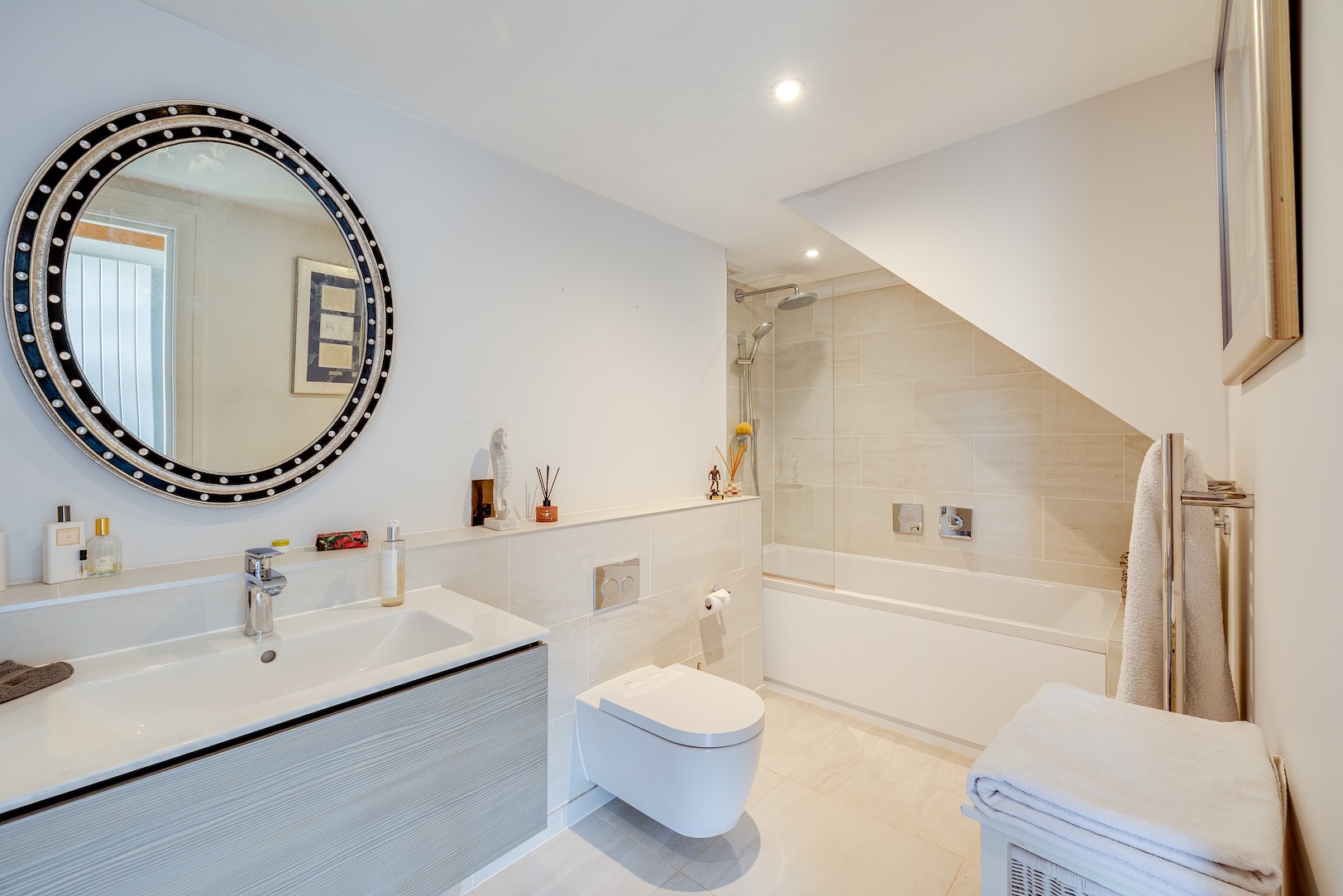 A wide staircase draws you down into the heart of the home. At this level, a bathroom awaits, styled in neutral tones and fitted with a shower over the bath, heated towel rail, basin and WC.