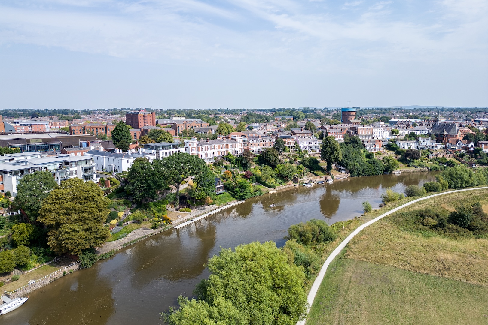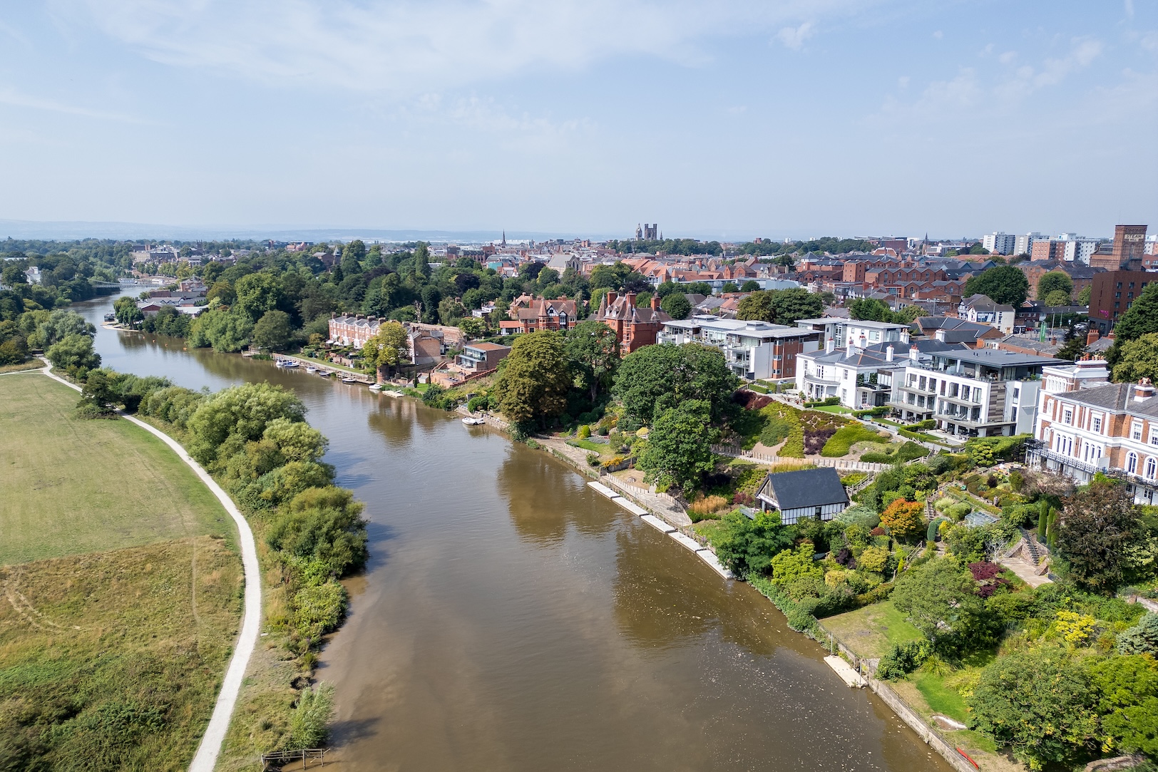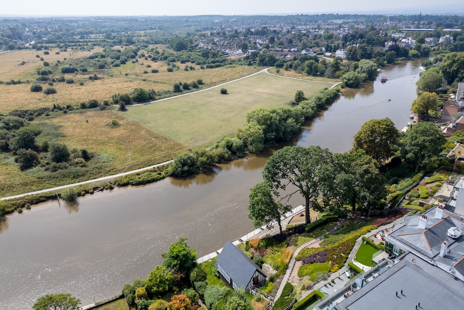 The Boathouse offers one of the most captivating vantage points in Chester. From the wide balcony, uninterrupted views stretch across the River Dee and the rolling meadows beyond, a living canvas that changes with the seasons. The ever-shifting light, the call of birds across the water, the gentle rhythm of passing boats: each moment brings a reminder of the privilege of riverside living.