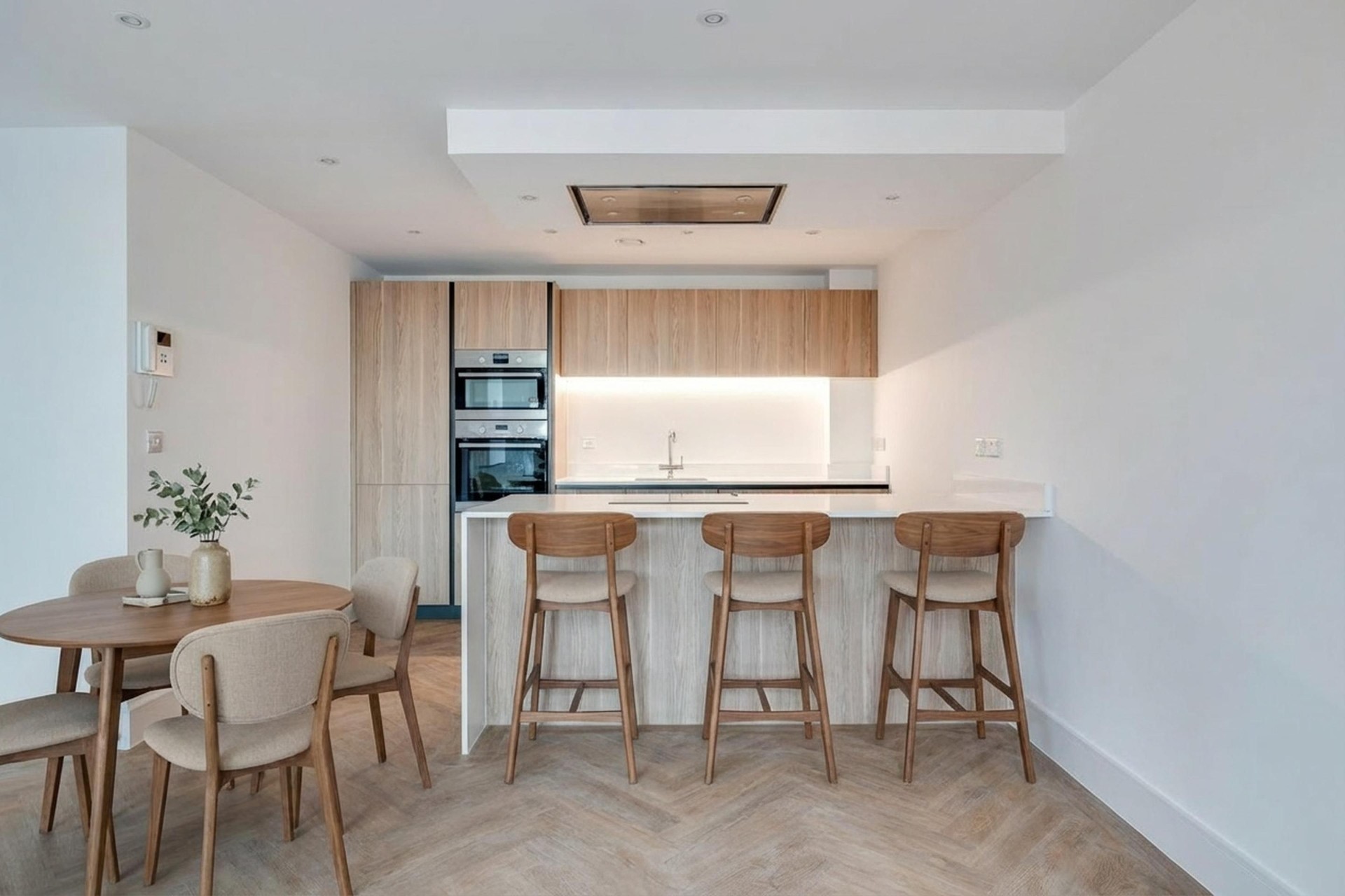 Each kitchen is a perfect blend of form and function. Sleek Porcelanosa handleless cabinetry pairs beautifully with white quartz worktops and a subtle oak veneer finish. Integrated AEG appliances, a wine cooler and an instant boiling water tap elevate daily routines into moments of quiet luxury. The separate utility room keeps life organised and clutter-free, while clever storage ensures that every inch of space works as beautifully as it looks.