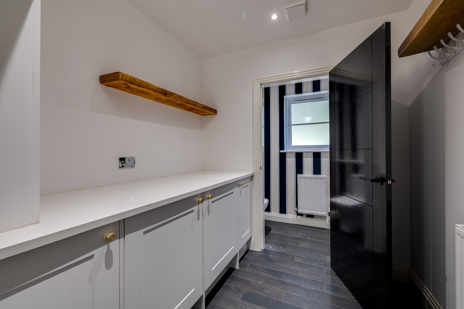 Every design choice has been considered. Wallpapers and paints by Colefax & Fowler, Ralph Lauren, Farrow & Ball and Mylands bring layers of texture and muted colour, while tones of soft blue weave through the predominantly monochrome palette. A utility room with laundry chute and cloakroom complete the ground floor, ensuring practicality underpins the elegance.