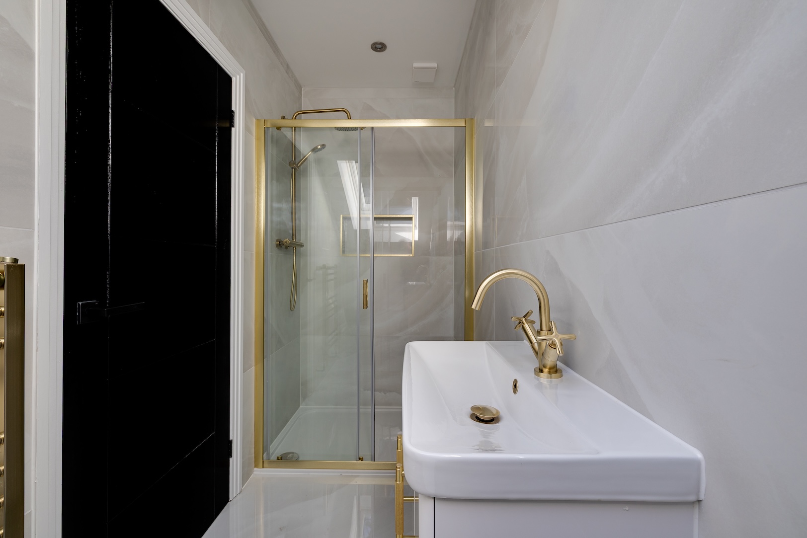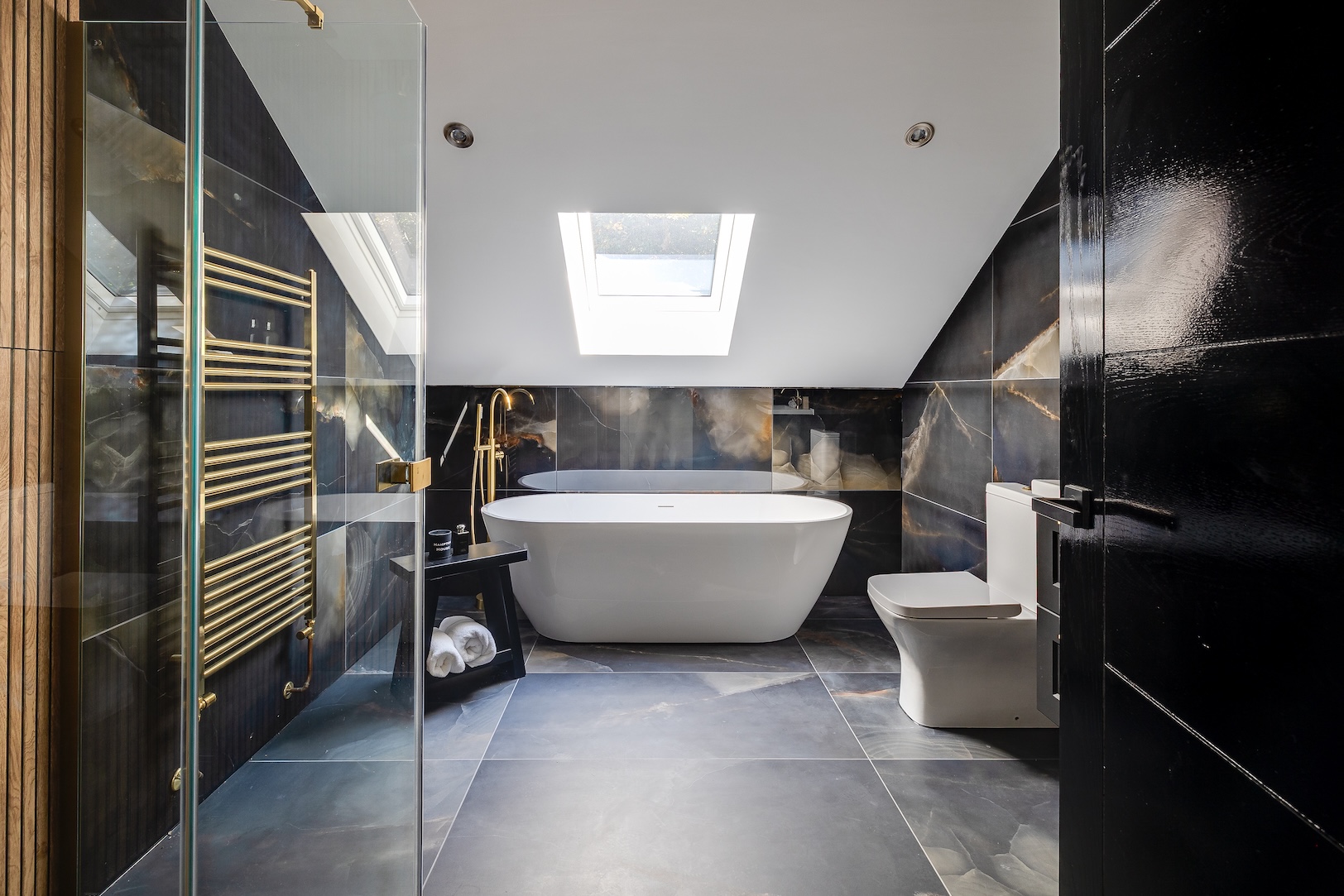 Stepping inside, the attention to craftsmanship is immediate. The front door itself is a bespoke piece in solid oak, its high gloss finish offset with nickel hardware and a hand-made frame that echoes the skirting and architraves within. The hallway unfolds in an L-shape, its ebony engineered wood floors striking against soft white walls. Light filters through black-framed crittal-style doors, a subtle nod to the house’s 1930s origin.