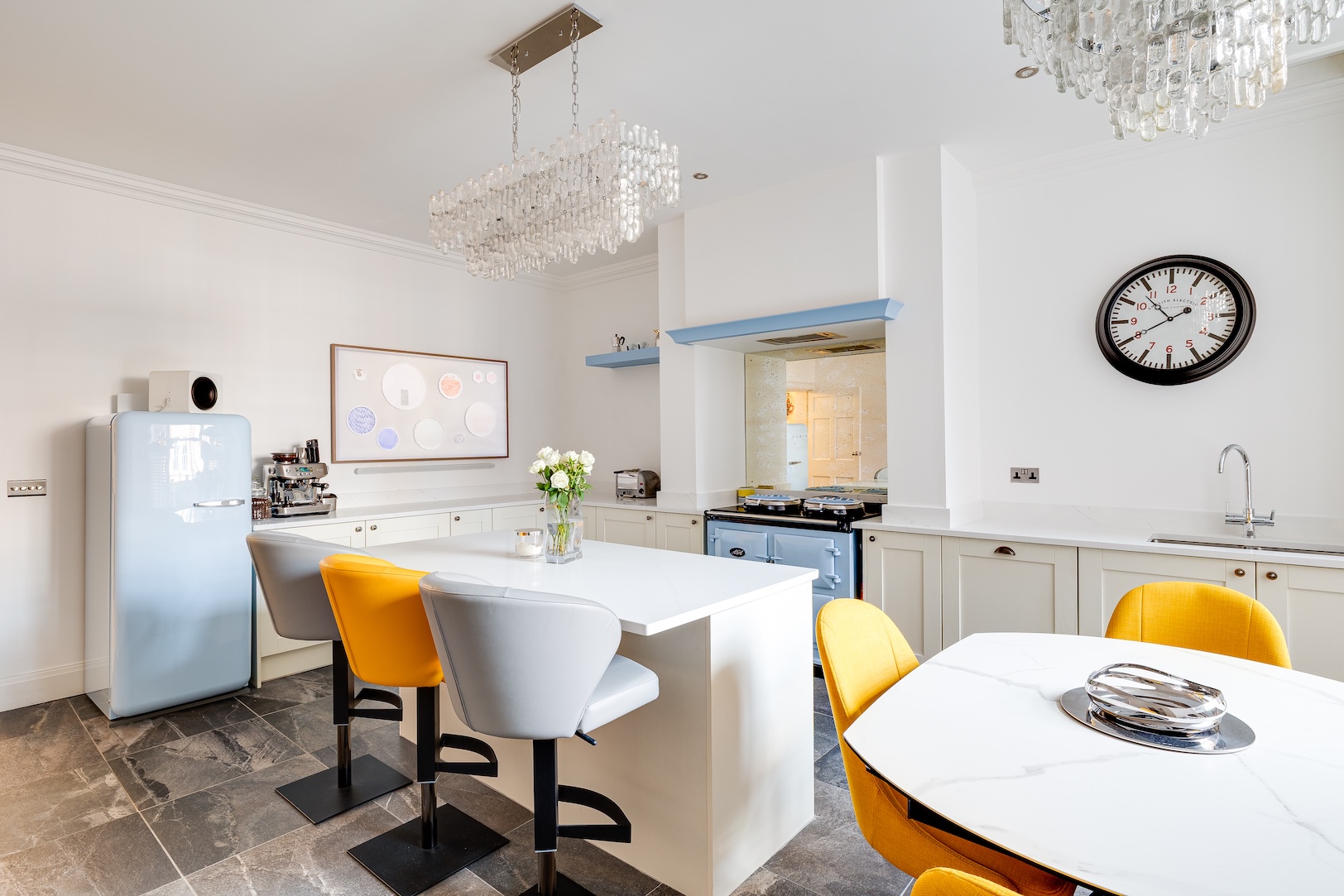 Touches of modern luxury abound: integrated appliances, a walk-in pantry and a wine chiller elevate both function and form. The AGA cooker, framed by delicate blue shelving, anchors the space with timeless elegance, while large sash windows draw the eye to the leafy courtyard beyond. Contemporary chandeliers add a touch of glamour, their crystal detailing casting a gentle light across the room.
