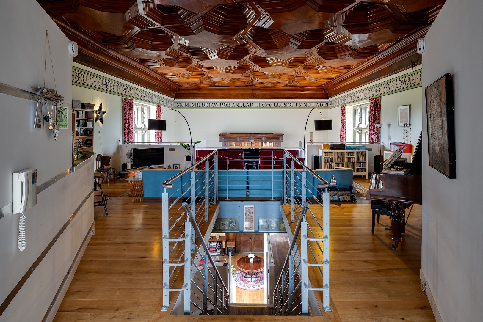 Open-plan living unfolds beneath soaring 30-foot ceilings, framed by a unique carved wooden roof (based by Ferrey on the Palais de Justice in Rouen), fringed by a Welsh-language frieze where it meets the walls. Open yet warm and homely, zoned spaces form around focal points, with a cwtch-like snug nestled around a spectacular 20-foot fireplace with log-burning stove.