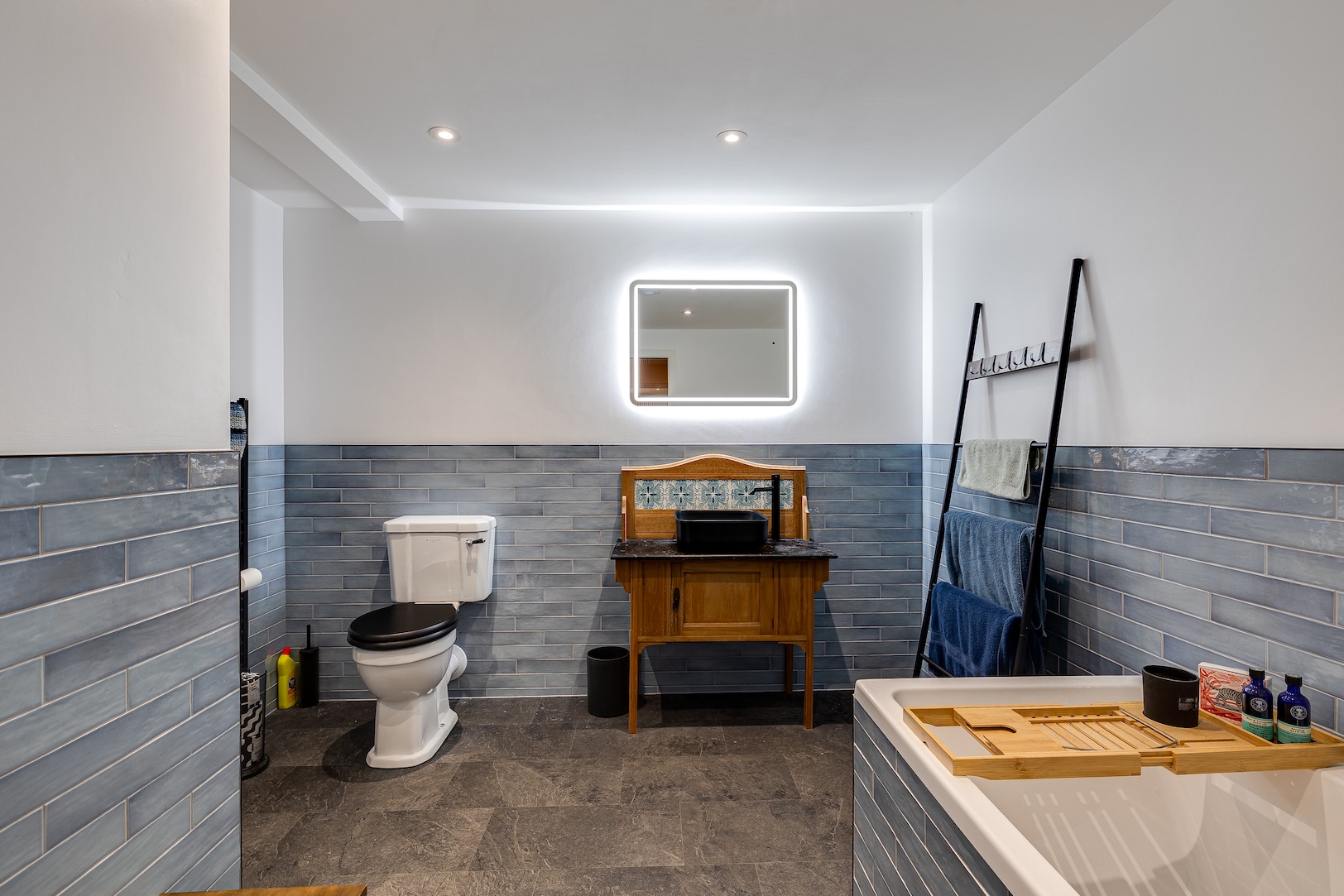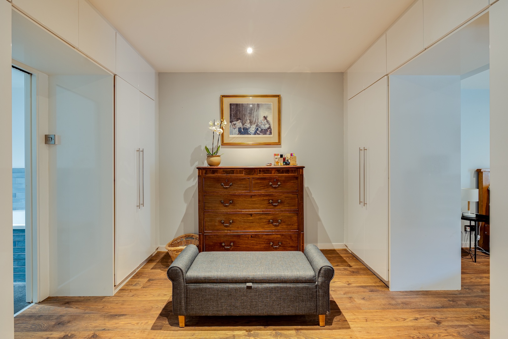 The fourth bedroom, now a calm office, links to a luxurious bathroom and a decked balcony for coffee breaks in the sunshine.