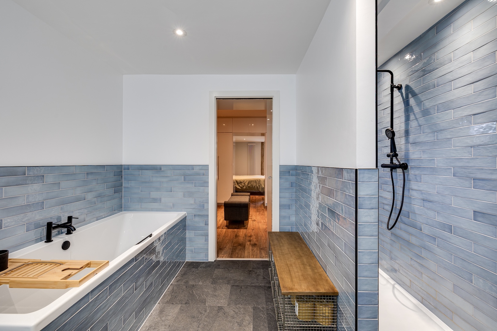 An indulgent triple-room sanctuary, the principal suite is privately tucked away, featuring a stormy blue-grey tiled bathroom with bath and separate walk-in shower, a storage-laden dressing room and a spacious bedroom with balcony access.