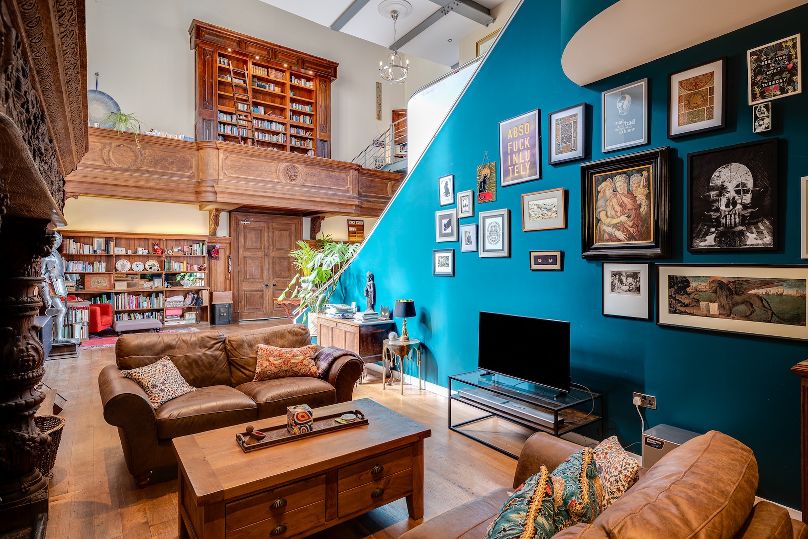 Modern living has been slotted in over three cruise-ship-inspired levels. A towering bookcase with secret door on a former minstrels’ gallery completes this extraordinary space.