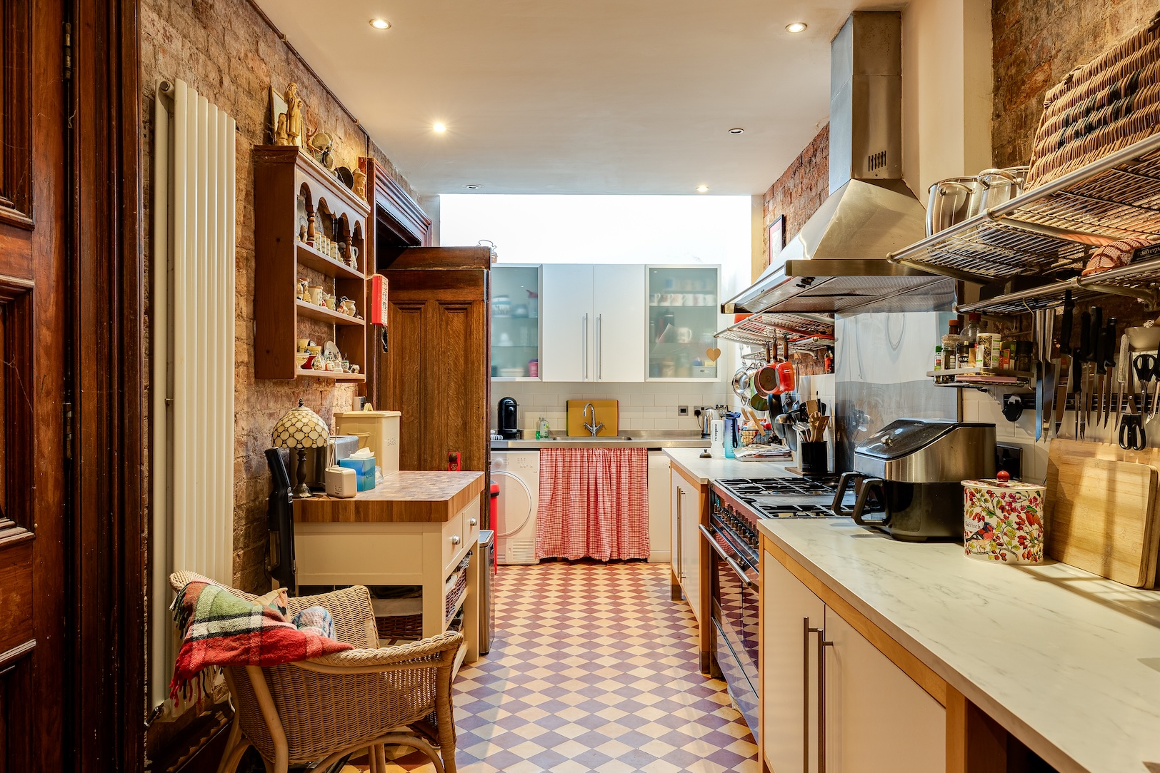 Exposed brickwork and checkered tiling lend an individuality to the kitchen, laid out in galley fashion and with ample space for a breakfast table. Beyond, a door leads to an outer hall, from where there is access down to The Great Hall’s labyrinthine cellars.