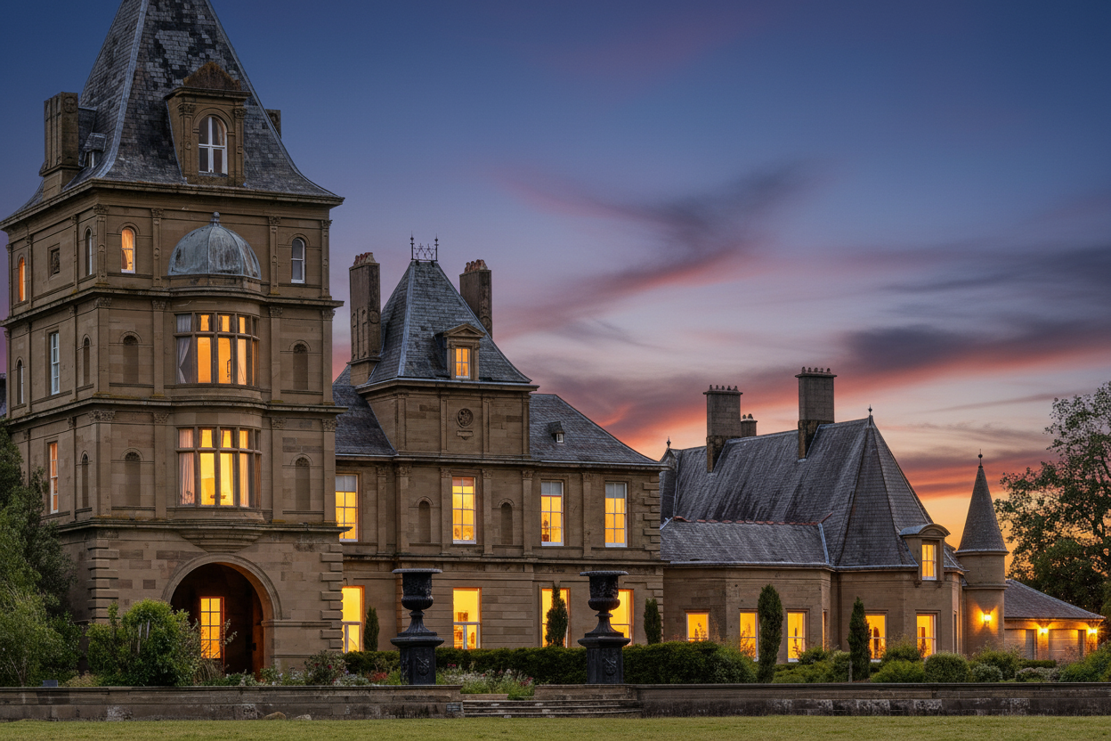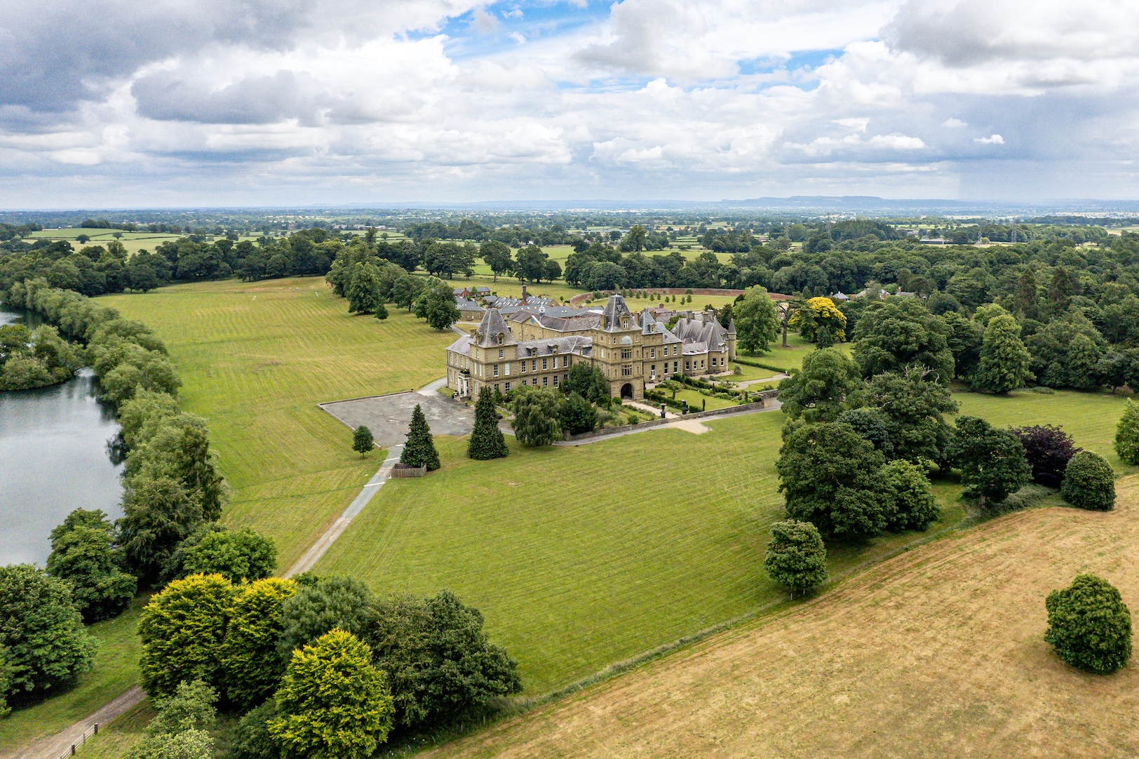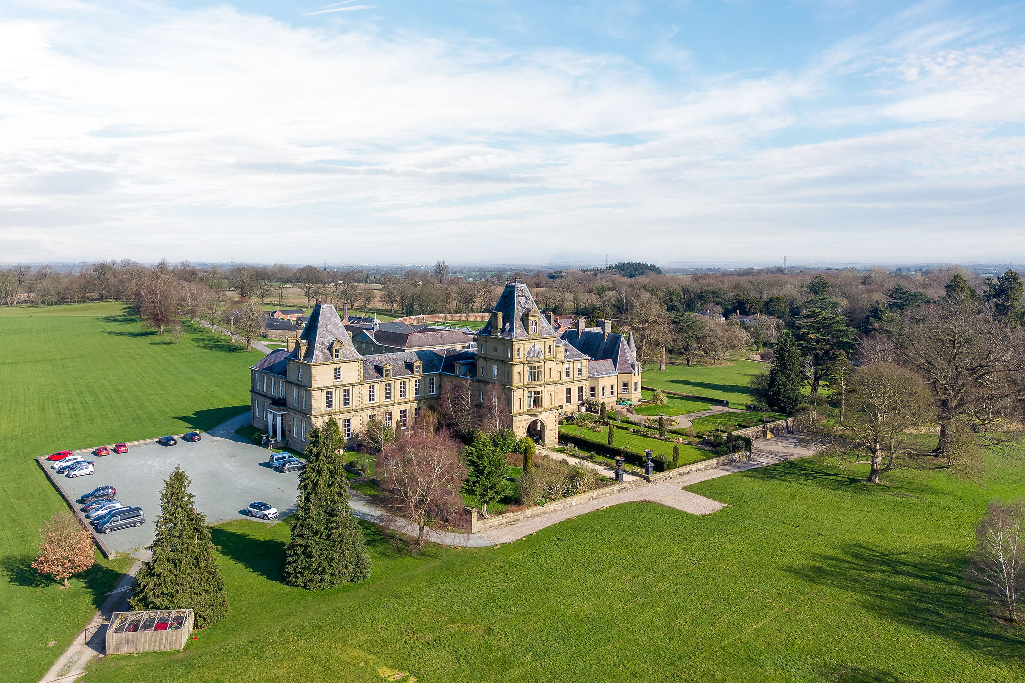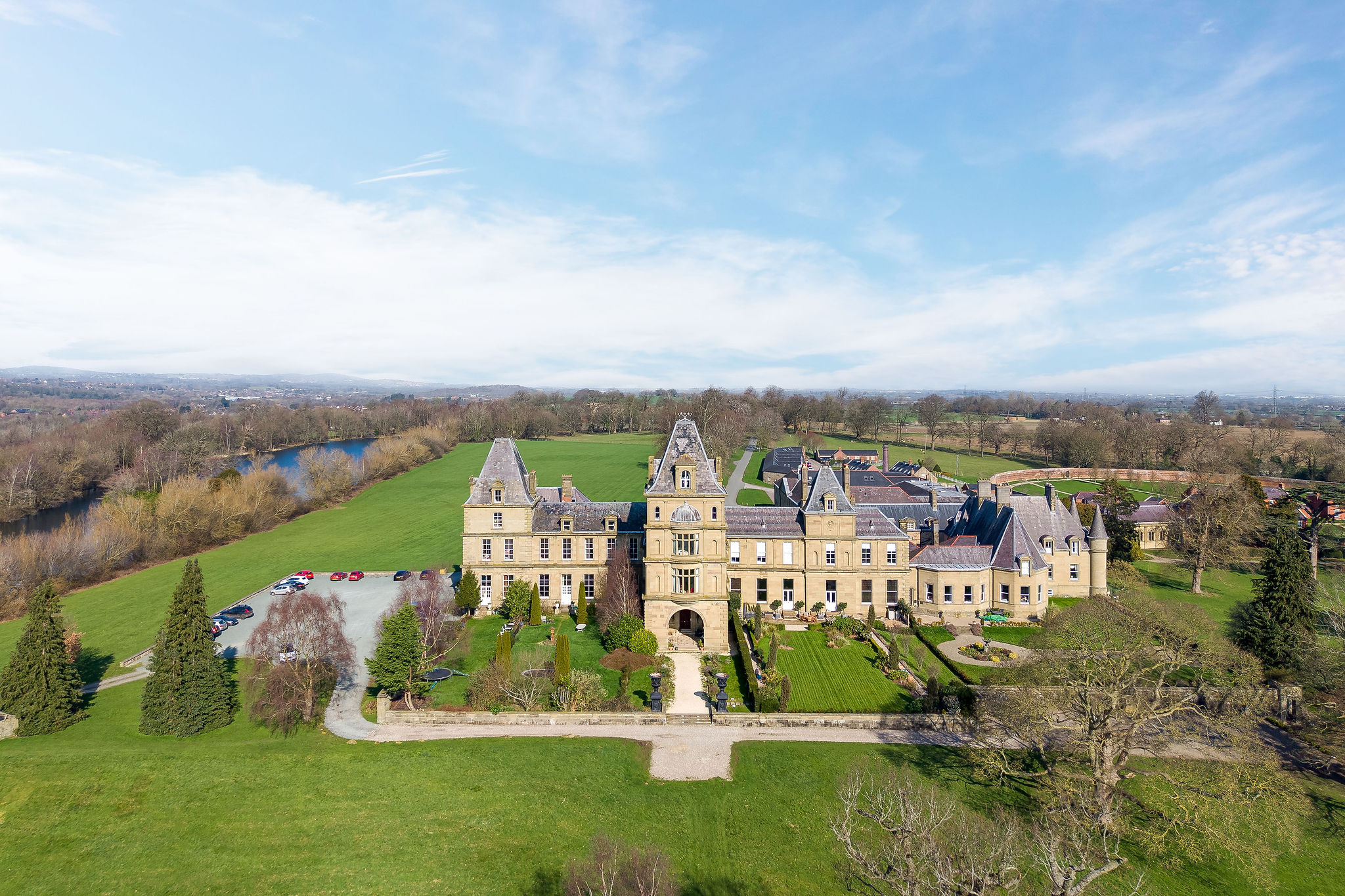 Rising from the ashes of a devastating 1858 fire, the family seat of the Watkins Wynn family in Ruabon was reimagined by architect Benjamin Ferrey in flamboyant French Gothic style, its turrets and porte cochere set against three private acres of Capability Brown’s wider sweeping parkland.