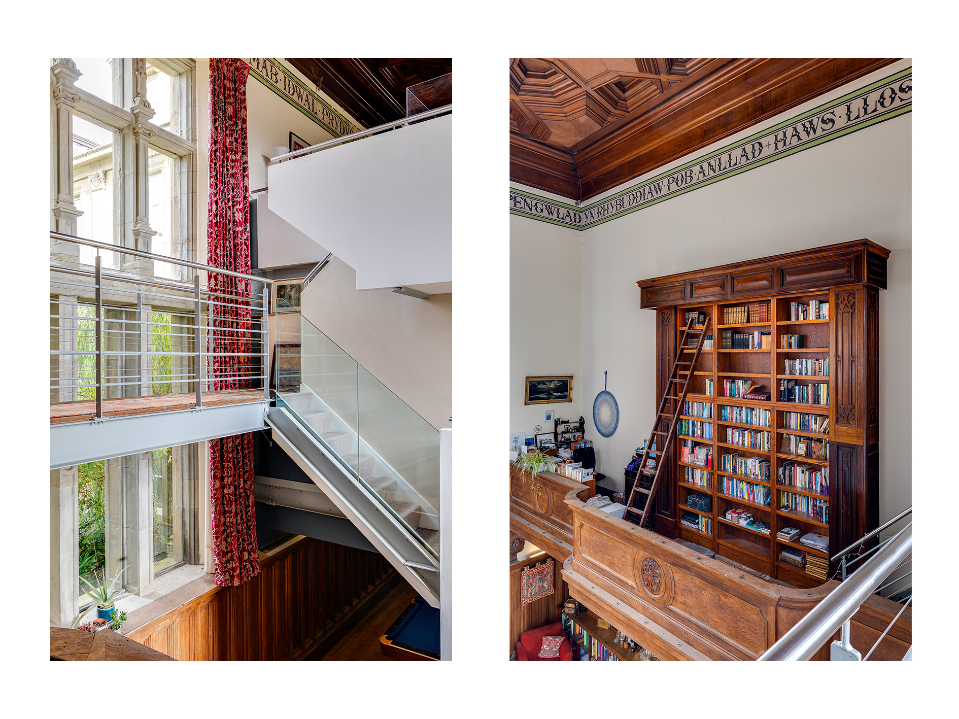 Up on the first floor, the gallery offers sweeping views across the Great Hall, with a striking perspective onto the 20-foot bookcase, once the setting for a grand organ which is now preserved in Cardiff Museum.